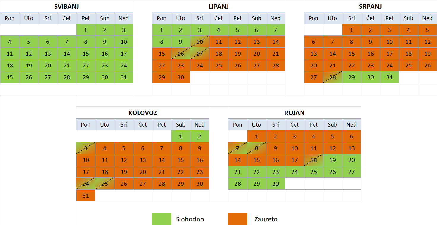 Ako je u tijeku potvrda rezervacije, kalendar popunjenosti ne pokazuje stvarno stanje, pa je potrebno poslati upit za provjeru je li traženi termin slobodan.