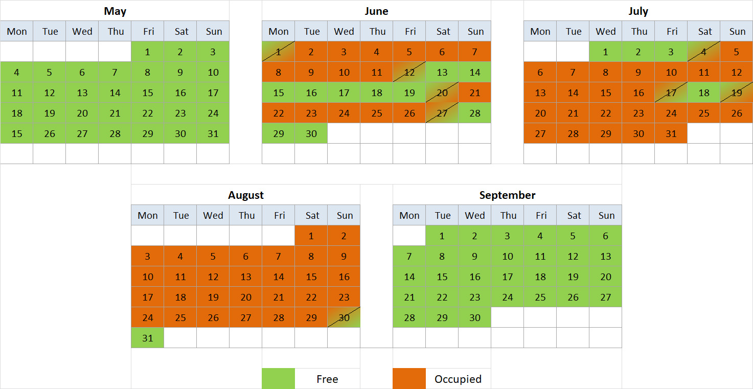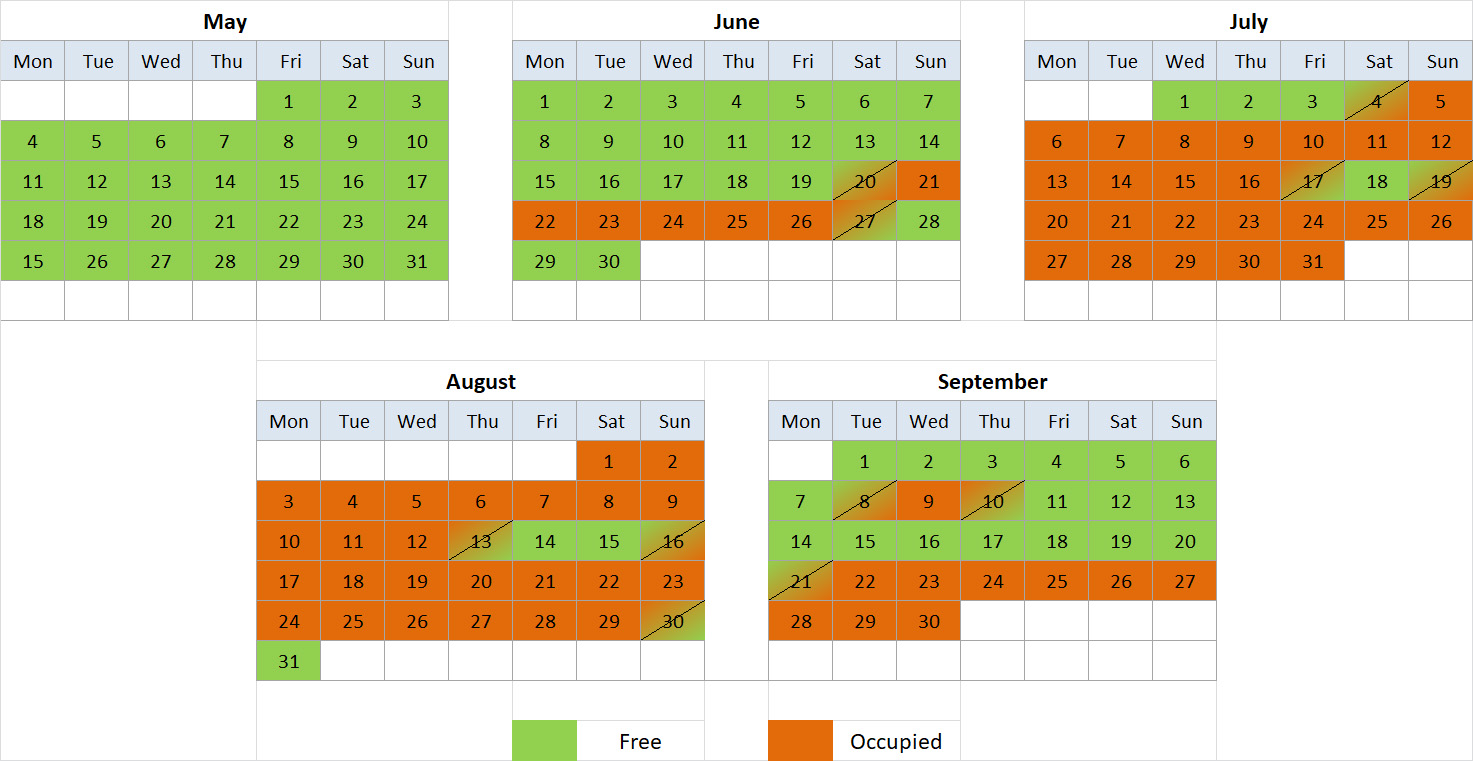 If the confirmation of the reservation is in progress, the availability calendar does not show the actual status. Therefore, you should send us a request to check whether the requested dates are available. We will gladly respond.