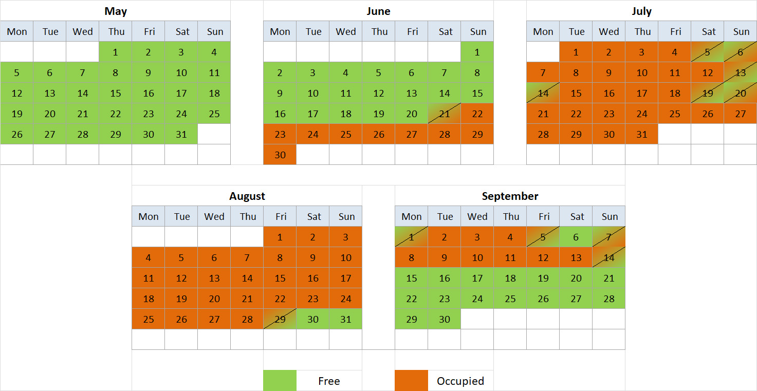 If the confirmation of the reservation is in progress, the availability calendar does not show the actual status. Therefore, you should send us a request to check whether the requested dates are available. We will gladly respond.