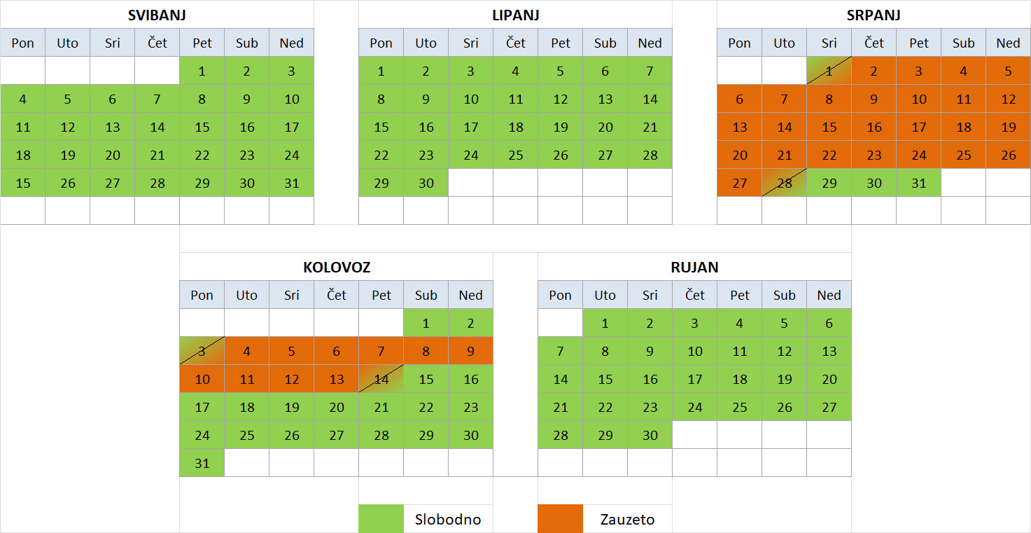 Ako je u tijeku potvrda rezervacije, kalendar popunjenosti ne pokazuje stvarno stanje, pa je potrebno poslati upit za provjeru je li traženi termin slobodan.